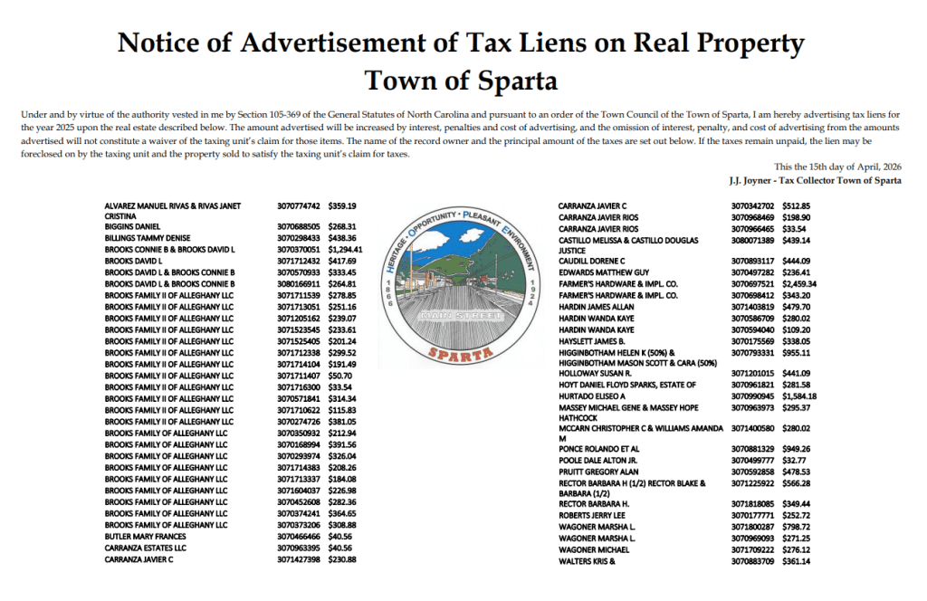 April: Property Tax delinquencies are advertised in The Alleghany News and will be posted opens in a new windowHERE.This will begin April 2023.